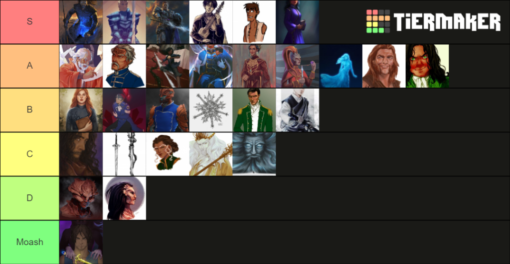 - S tier: Kaladin, Adolin, Dalinar, Wit, the Lopen, Jasnah