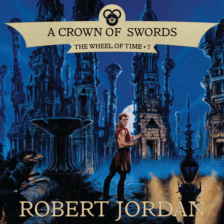 Like the last few covers, this one depicts the grand climax of the story. Standing front and center is Rand, looking weirder than ever with his sleeveless coat and short hair. He stands in Shadar Logoth during the night. To the left, we see a lurking bird Trolloc, likely trying to get the jump on the Dragon Reborn. And on the right… I’m not sure. Is that supposed to be a sand pit? Some trap set by Sammael?