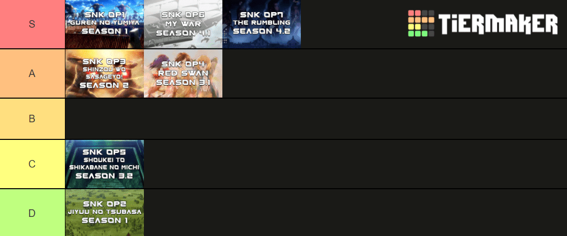 S tier: OP1 Guren no Yumiya, OP6 My War, OP7 The Rumbling
