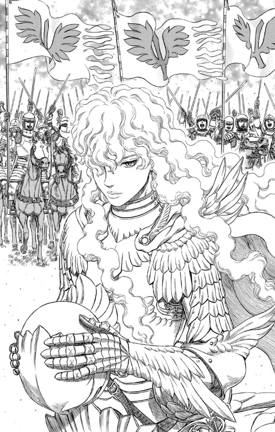 Griffith is a living enigma. Nobody, not even those closest to him, ever truly knows what’s going on in the man’s head. His ultimate objective is no secret; he wants to become a king. But the how, and even the why, of it isn’t known to his peers. Most people don’t even know how he truly feels or what his real personality is like. All they know is that he’s larger than life. Angelic, almost.