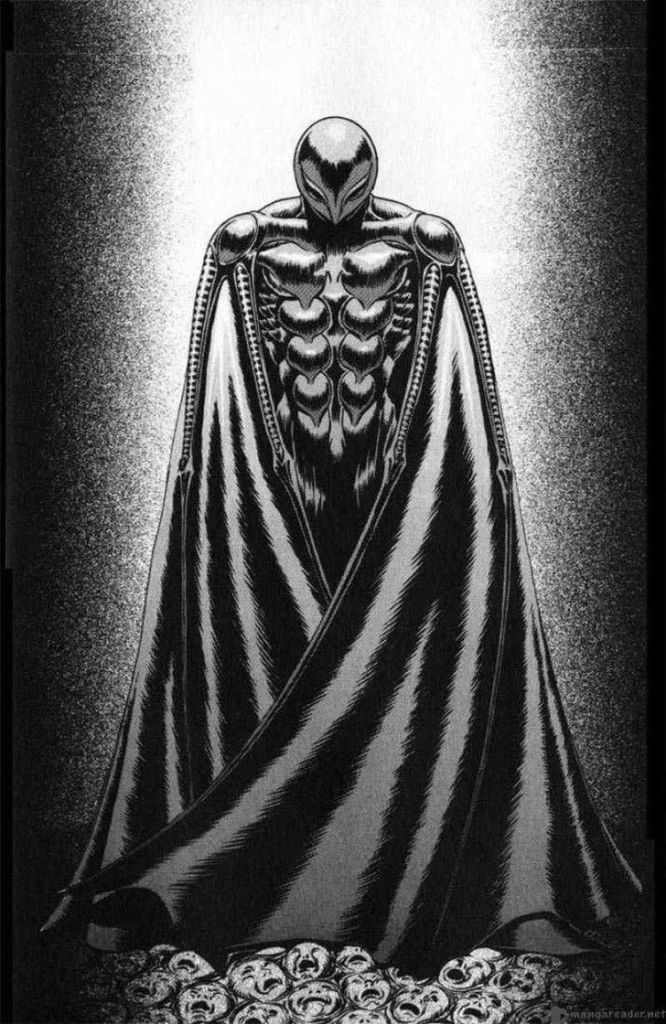 Griffith’s demonic appearance is a reflection of the man beneath the divine deception from before. Where once he was a beautiful man clad all in white, now he is a heartless monster enveloped all in black. He maintains the shape of his signature helmet, but now it’s his true face, with his human-like features hidden beneath. Unlike before, however, his human face puts his emotions on full display; in this form, Griffith doesn’t bother trying to hide his contempt for others.