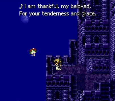 My personal favorite is the scene with Celes and Cid right after the world is remade. Cid is sick and all you can do is go to the coast and get him fish to ward off his condition. You can go elsewhere to try and fight enemies, but anything you run into dies on its own almost immediately. All you can do is keep bringing Cid fish, preventing his dialogue from progressing, keeping him alive. Delaying the inevitable.
