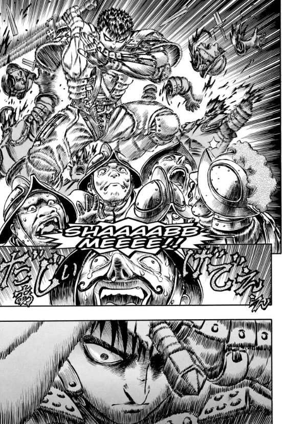 But what about Guts? Well, he does what he does best: he gets pissed. He brutally murders the tortur master in one of the most grotesque yet satisfying deaths in the whole series. After that, he goes on a full-blown rampage.