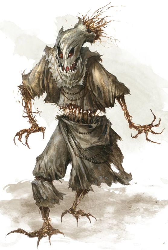 Simple as this lore is, it’s got a fair bit of storytelling potential! Perhaps the players are on the hunt for a witch and they come across a scarecrow set to protect her. Or maybe they come across a scarecrow bereft of a master and need to find a way to bring it to peace in order to reach a valuable treasure.