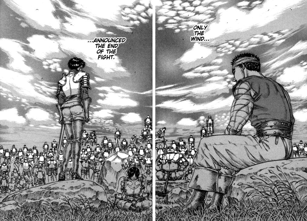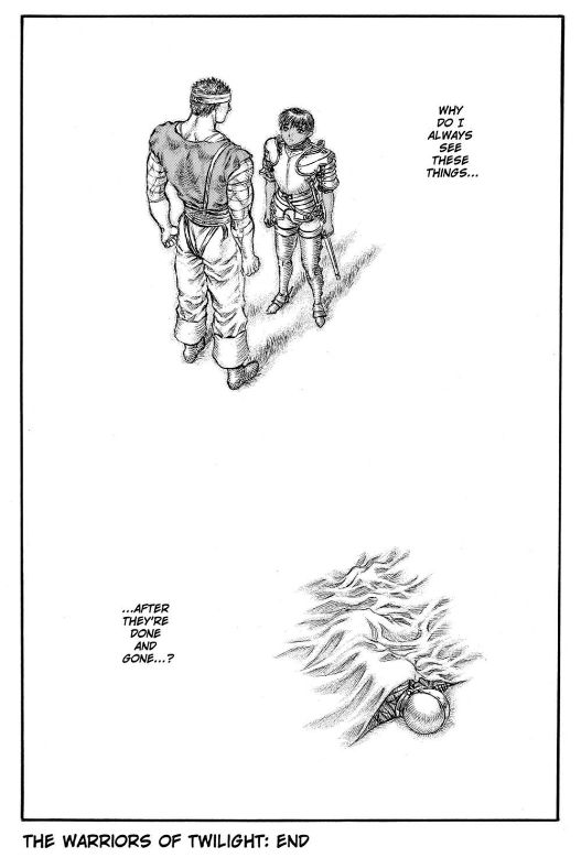 These chapters really hit Guts – and therefor me – where it hurts. Faced with the end of the Hawks, the one true family he ever had, he finally realizes that leaving was a mistake. But that realization comes too late. I think that’s something everyone can relate to; all of us come to a point in our lives where we have to make an important decision about our futures. I’m sure a good number of us have come to regret it in the same way.