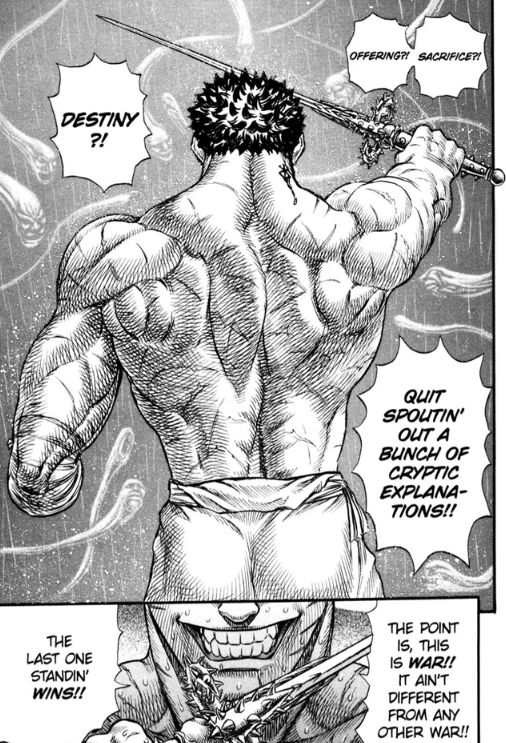 So what does Guts do? The same thing that he’s always done. Remember: Guts has a simple rule to life. If you hit him, he’s gonna hit you back. Really. Fucking. Hard.