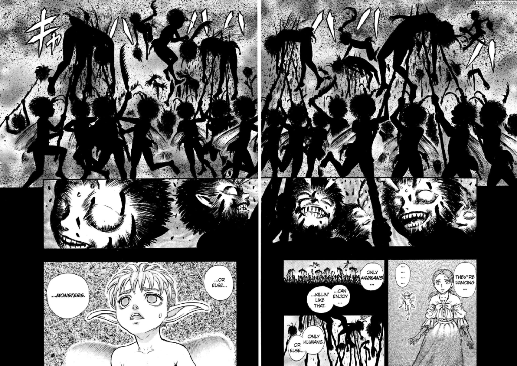 Finally, the horror. Berserk is already horribly dark and uncomfortable. But seeing all these terrible things happening to children is even worse. Especially when Rosine’s ‘elves’ take the stage. Their ‘play war’ scene is some serious nightmare fuel!