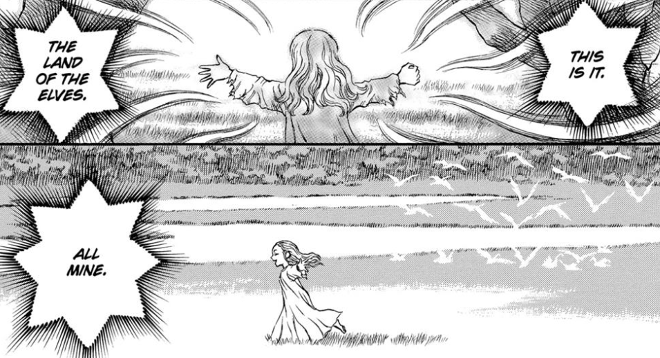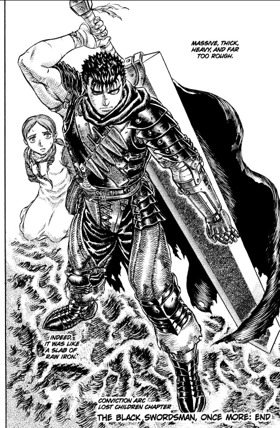 This scene is a shining example of why I love Berserk. Not for the violence, but for moments like these. Moments where a man drowning in darkness and despair wraps a child in his cloak and gently gives her the harsh truth. A small moment of honesty and kindness from a man so dangerously close to becoming a monster. He pushes her away, giving her the encouragement he needs as he leaves her life forever.