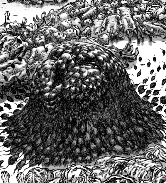 If you thought Berserk’s world was rough and brutal before, you’ll be horrified to discover the series is just getting started. Gruesome plagues and oppressive storms leave the land dark and bloody. It all sets the tone for the rest of the arc perfectly.
