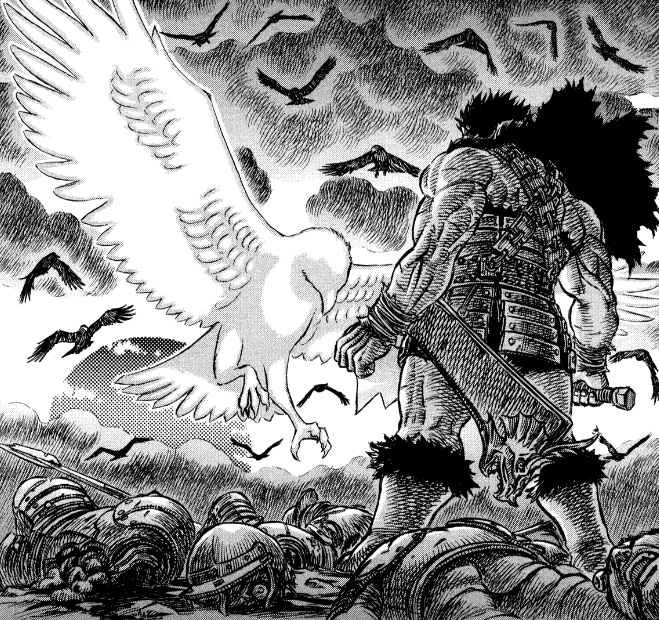 All of Midland shares in a dream: when a terrible shadow falls over the land, the Hawk of Light will appear and bring salvation. A fitting dream, given the growing darkness swallowing the land. In a distant, lonely corner of this dying land, Guts lays down for a rare moment of rest. One cut short by a dire warning.