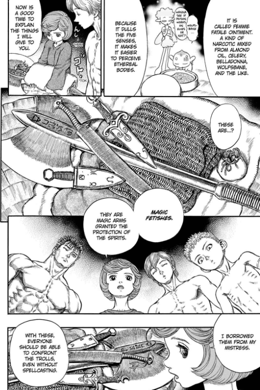 We rejoin our party as they gather their equipment for the upcoming troll hunt. After Schierke places a ward on Guts and Casca to dampen the Brand’s effects, she distributes magical items to all the rest. Think Galadriel giving gifts to the Fellowship and you’ll get the gist.