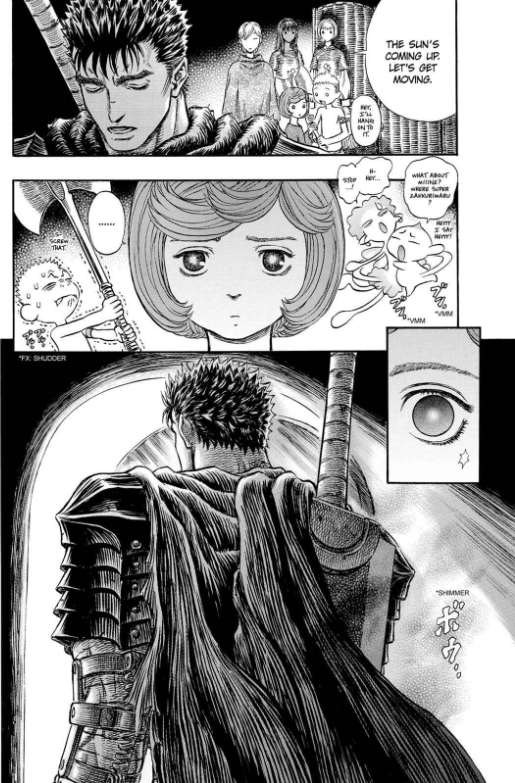 Geared up and rested, the party make to depart. But Schierke isn’t exactly eager. She only sees her new companions as an unnecessary nuisance, especially Isidro. She also tries to convince them to leave Casca behind, but Guts shoots the idea down immediately, entrusting her to the unconfident Farnese’s care.