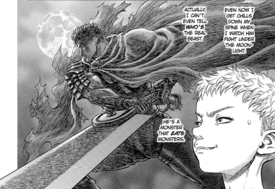Finally, Schierke offers Guts an axe, but Guts refuses the weapon. He prefers to use the weapon he knows best. Besides, the Dragon Slayer is way fucking cooler than some random axe. Not only that, but Schierke notices something strange about the sword, though what, we don’t yet know.