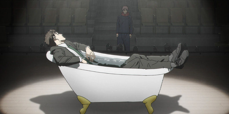 Yet that still isn’t my favorite episode. That one goes to Yuji’s encounter with Higuruma, disgruntled lawyer turned deadly Sorcerer. Who bathes fully clothed and fights in a sopping wet suit.