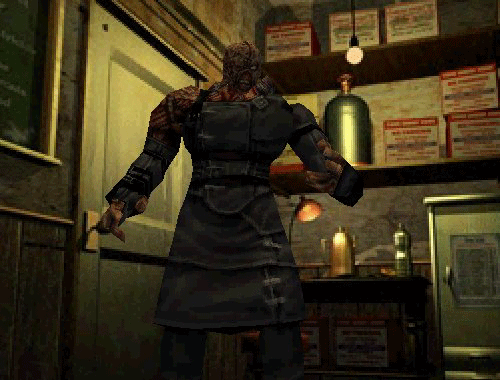 With one exception: RE3’s titular Nemesis. He is, by far, the most terrifying enemy in the whole trilogy. Unlike other bosses, who are restricted to their arenas, Nemesis can attack you seemingly at any time, any place. He’s fast, smart, extremely deadly, and even more durable. Try to run away, and he’ll pull out a god damn rocket launcher! Or he’ll just charge you down at full speed.